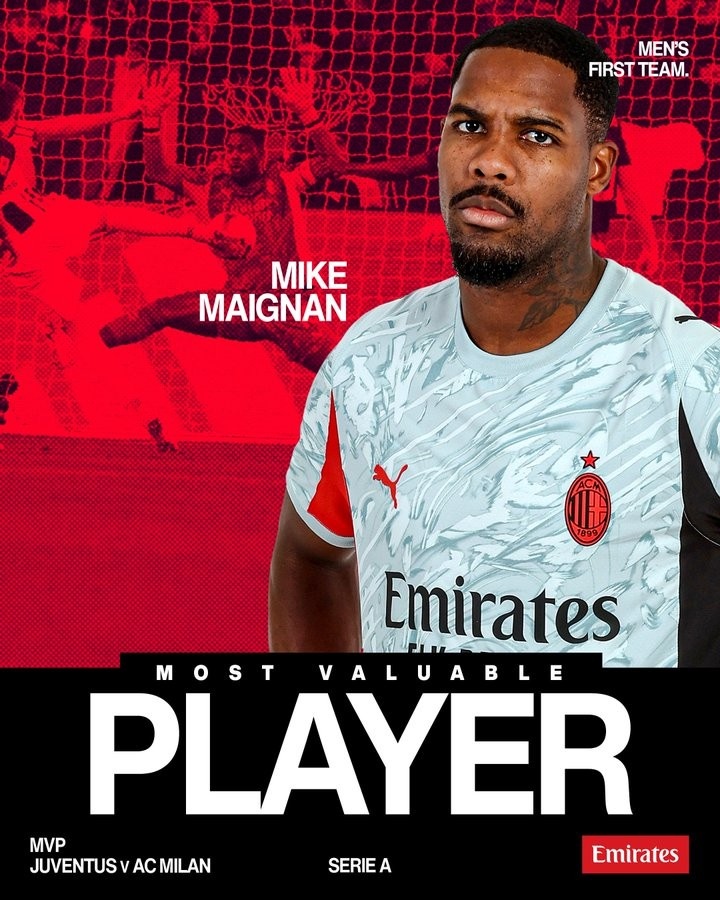 米兰官方文告,迈尼昂当选本场比赛队内最好。