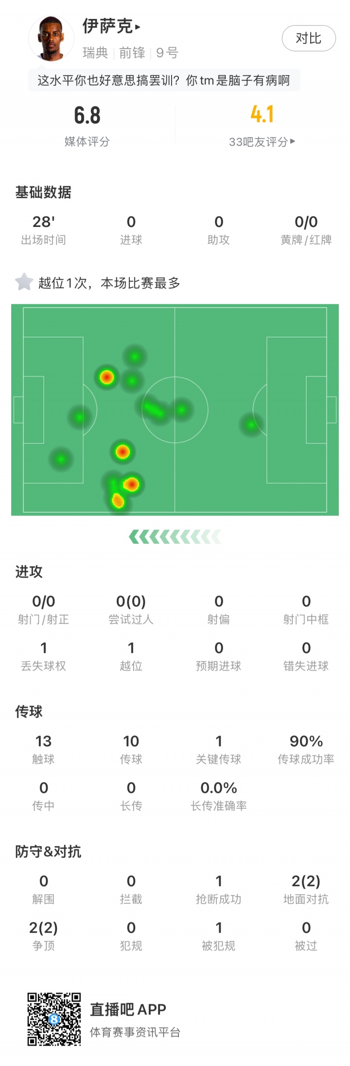 伊萨克是瑞典阵中身价最高(1.4亿欧)的球员,但本届世初赛于今他仍未得回进球。本场他替补登场半小时,未能匡助球队扭转场面。