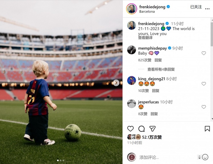 德容的男儿迈尔斯迎来2岁生辰,德容社媒晒出迈尔斯在诺坎普球场的像片,配文:“2023年11月21日,这寰宇属于你,爱你。”