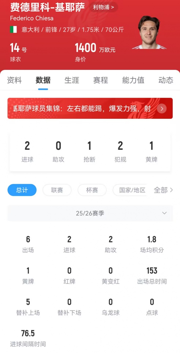 本赛季,基耶萨还是为利物浦在各项赛事中出场6次,孝敬2球2助,现在的身价为1400万欧元。