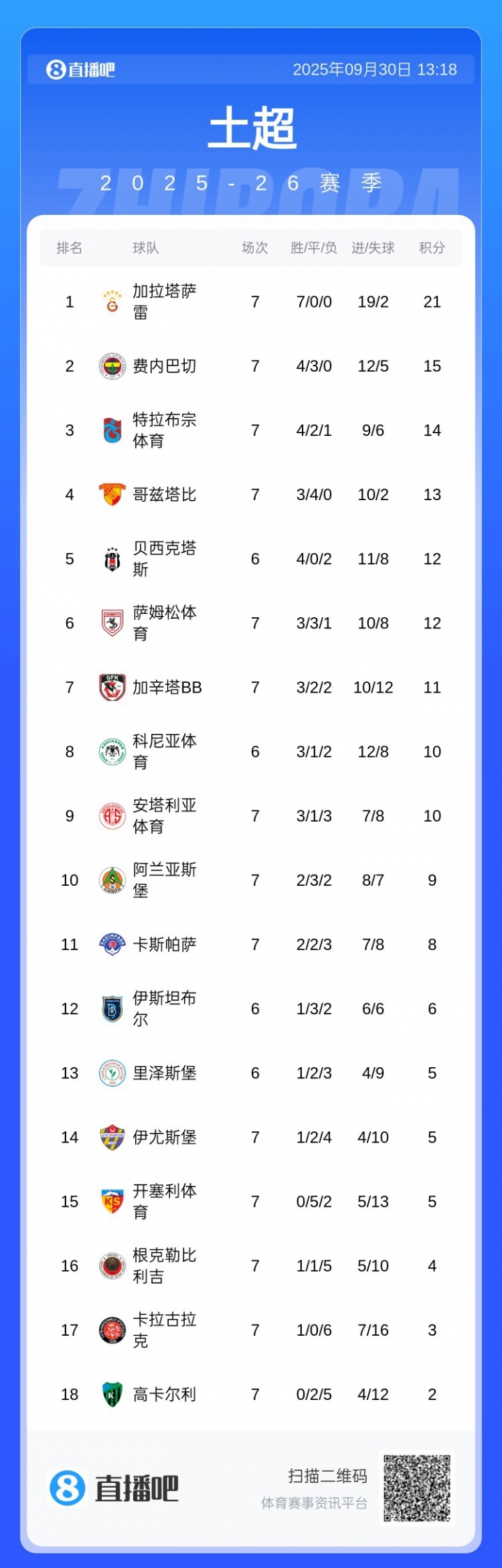 加拉塔萨雷本赛季在土超7场全胜领跑,进19球仅丢2球。