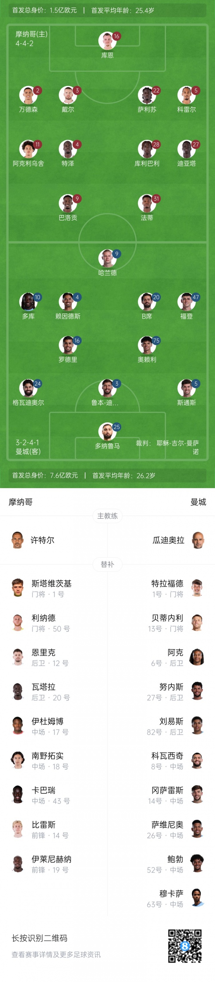 摩纳哥首发:16-库恩、2-万德森、3-戴尔、22-萨利苏、5-科雷尔、11-阿克利乌舍、4-特泽、28-库利巴利、27-迪亚塔、9-巴洛贡、31-法蒂