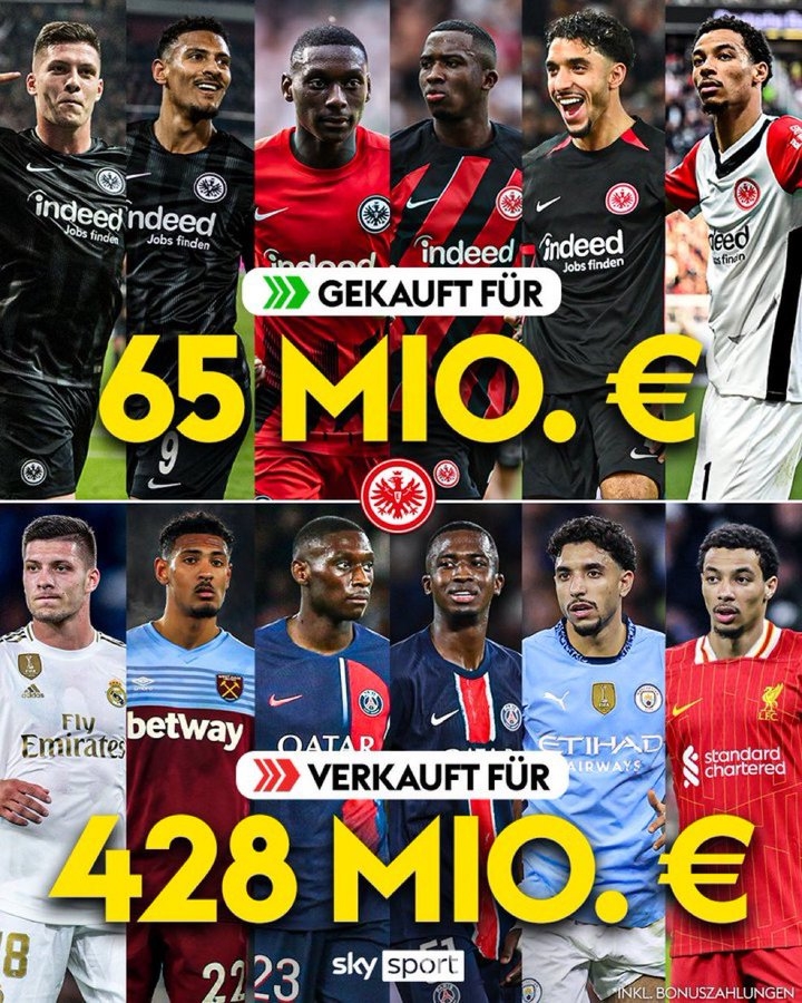 法兰克福向来有“德甲黑店”的传统,约维奇、阿莱、穆阿尼、帕乔、马尔穆什、埃基蒂克等东说念主齐被他们以较低的价钱买入,之后高价卖出。