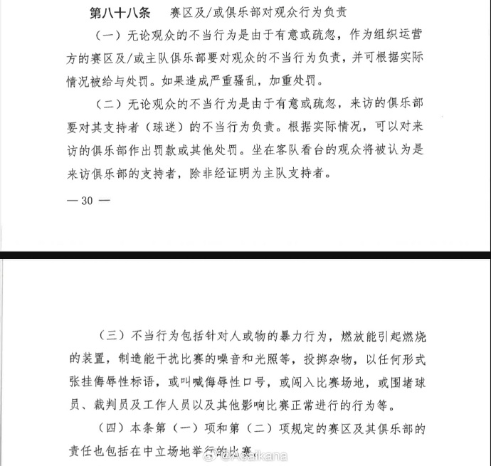 在本年新发布的中足联次第谈德准则里,“愤激”(包含种族、肤色等愤激活动)是特意增多的本色,这亦然反映了海外足联严打赛场种族愤激活动的要求。此前,做事联赛种族愤激事件多发,由于短少相应条件或凭据,成果多不昭着之或以其他原理替代。但最新文献明文律例,球迷有愤激活动的,一朝凭据可信(一般指可供相沿施展其活动的视频摄像、东谈主证、比赛官员的论述、听证纪录等),其所相沿的俱乐部将被处甚而少50万元的无数罚金,并将根据次第谈德准则进行进一步处治(关闭部分看台或一起空场等)。