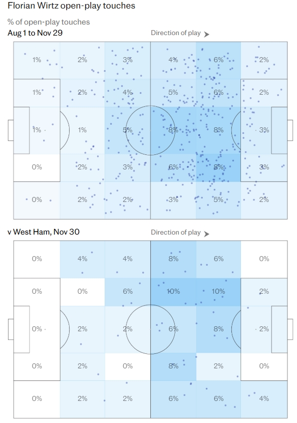 利物浦在2-0西汉姆的比赛中,迎来了从低迷到“维尔茨式”新生的转移,这位以1.15亿英镑转会费加盟球队的中场带领官打出了他在英超最全面的发扬,印证了斯洛特围绕这位德国新星建队,从而拯救这个赛季并稳住帅位的构思。
