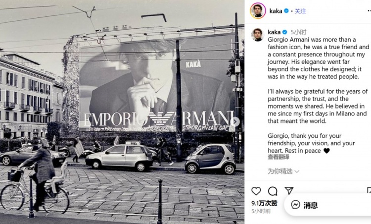 9月5日讯 不久前,卡卡更新外交媒体,惦记了昨日离世的乔治-阿玛尼。