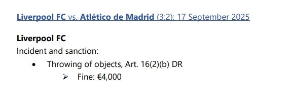 10月01日讯 欧冠首轮比赛,利物浦3-2顺服马竞。本场比赛中,利物浦因为球迷投掷物品,违犯《欧足联法式准则》第16(2)(b)条,俱乐部被罚金4000欧元。