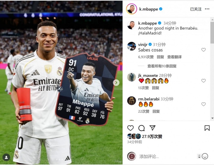 姆巴佩更新社媒动态,晒出赛前领取西甲9月最好球员奖杯的像片,配文:“又一个奥密的伯纳乌之夜,Hala Madrid!”