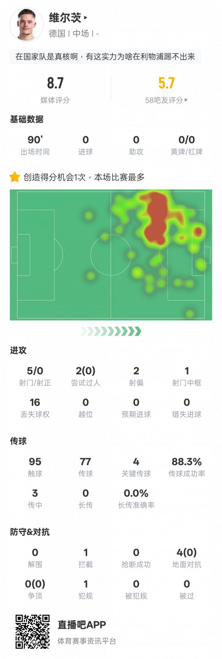 10月11日讯 世初赛欧洲区小组赛A组第3轮,德国4-0卢森堡。维尔茨首发出战,1次掷中门框,送出4次关键传球,创造1次进球契机,评分8.7。