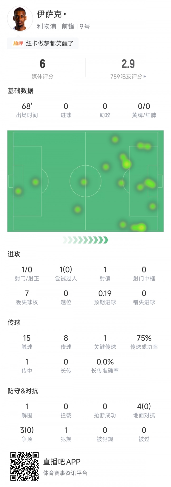 利物浦从纽卡淘来的时尚伊萨克浮现欠佳,本场的数据更是说来话长。赛季初的罢训事件和他此前的伤病依旧影响着这名瑞典神锋。