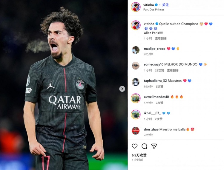他也在赛后通过社媒晒出我方的比赛照,并配文:“ 何等精彩的欧冠之夜!🤯❤️💙⚽️⚽️⚽️巴黎加油!”