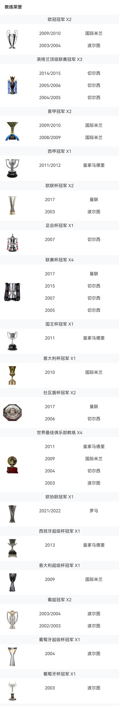 62岁的穆里尼奥最近一次率队夺冠也曾21/22赛季在罗马拿到的欧协联冠军。再往前记忆,等于曼联时代16/17赛季拿到的“小三冠”。