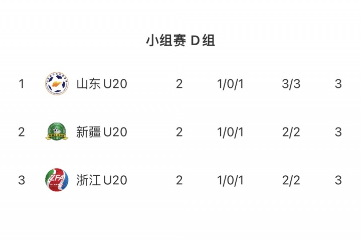 浙江处所的D组出现了极为落索的情况,山东队、浙江队、新疆队积分均为3分,且净胜球均为0球。山东队凭借总进球数多(进3球)的轻捷上风取得小组第一。浙江队和新疆队总进球数均为2球,红黄牌数目也皆备一致,或将通过抽签决定八强临了一席出线权。