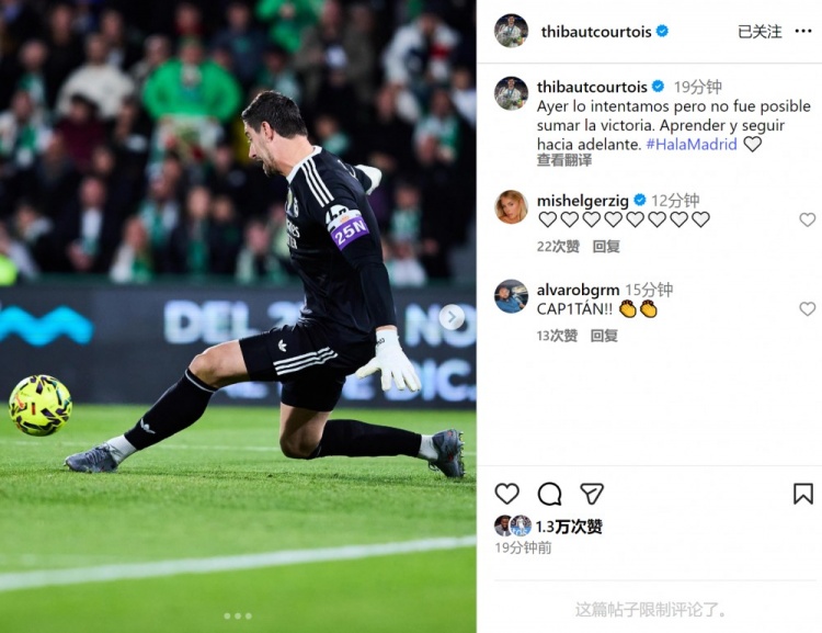 皇马门将库尔图瓦社媒晒出比赛像片,配文:“昨天咱们拼尽全力,但未能获得得手,咱们会吸取教化,持续前进。”