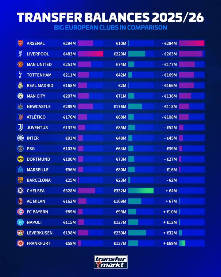 09月05日讯 德转统计了大俱乐部的夏窗净进入排名,枪手2.84亿居首,赤军第2,曼联第3。